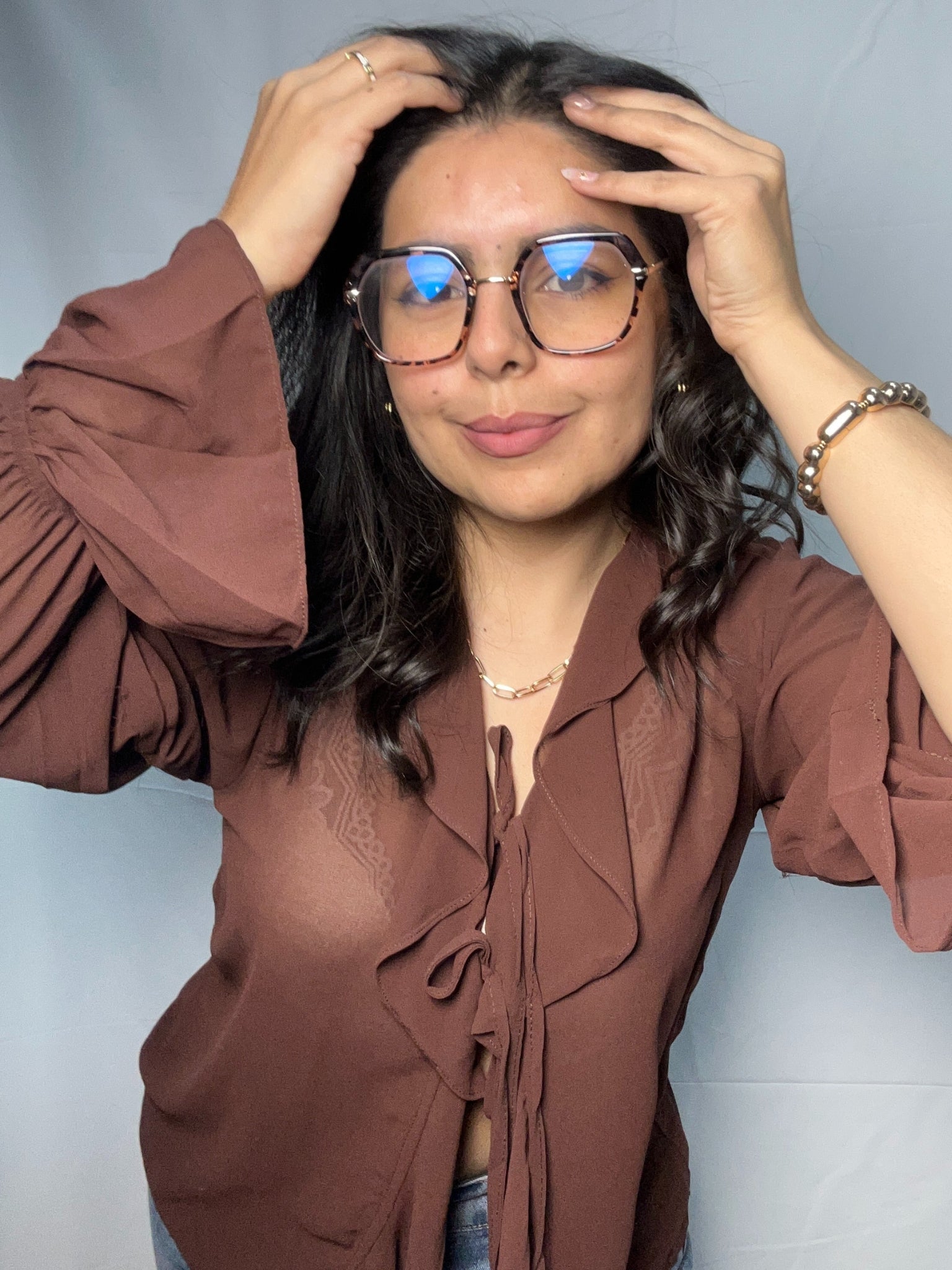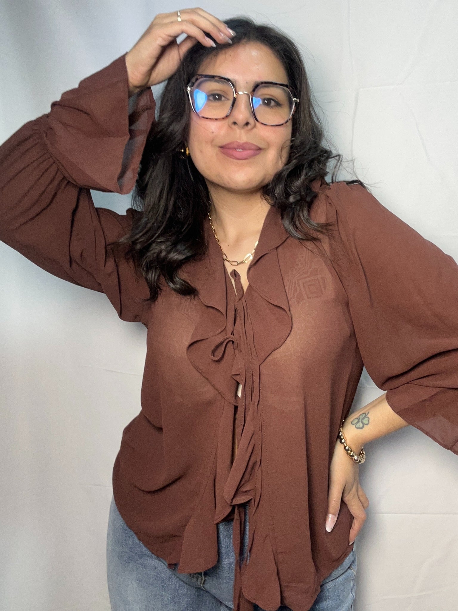 Destaca por su cuello elegante y mangas amplias con caída fluida, que añaden movimiento y un look moderno a la prenda. El color chocolate profundo le da versatilidad, permitiéndote combinarla fácilmente con jeans, faldas o pantalones de vestir para diferentes ocasiones.