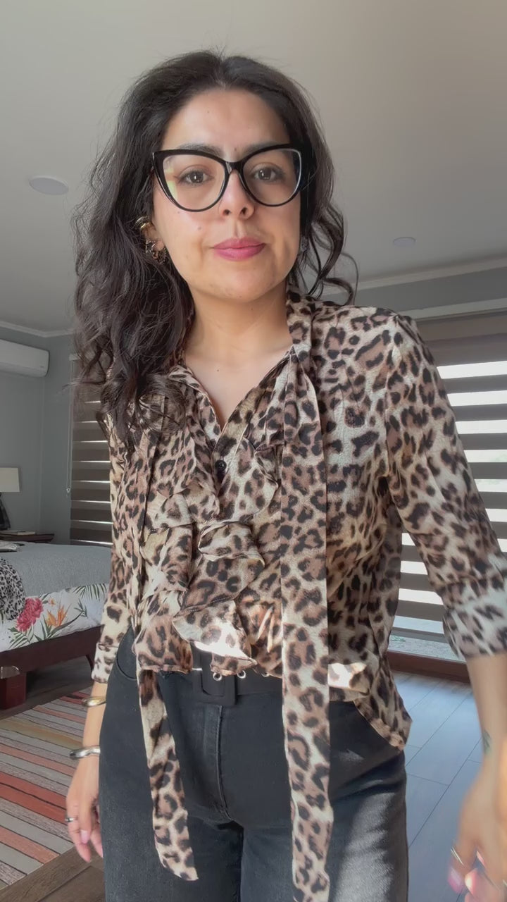 Blusa de estampado animal print con delicados vuelos en la parte frontal y dos tiras largas decorativas que aportan un toque moderno y sofisticado. Su calce holgado ofrece comodidad sin perder estilo, ideal para combinar con jeans o pantalones para un look casual chic o de oficina.