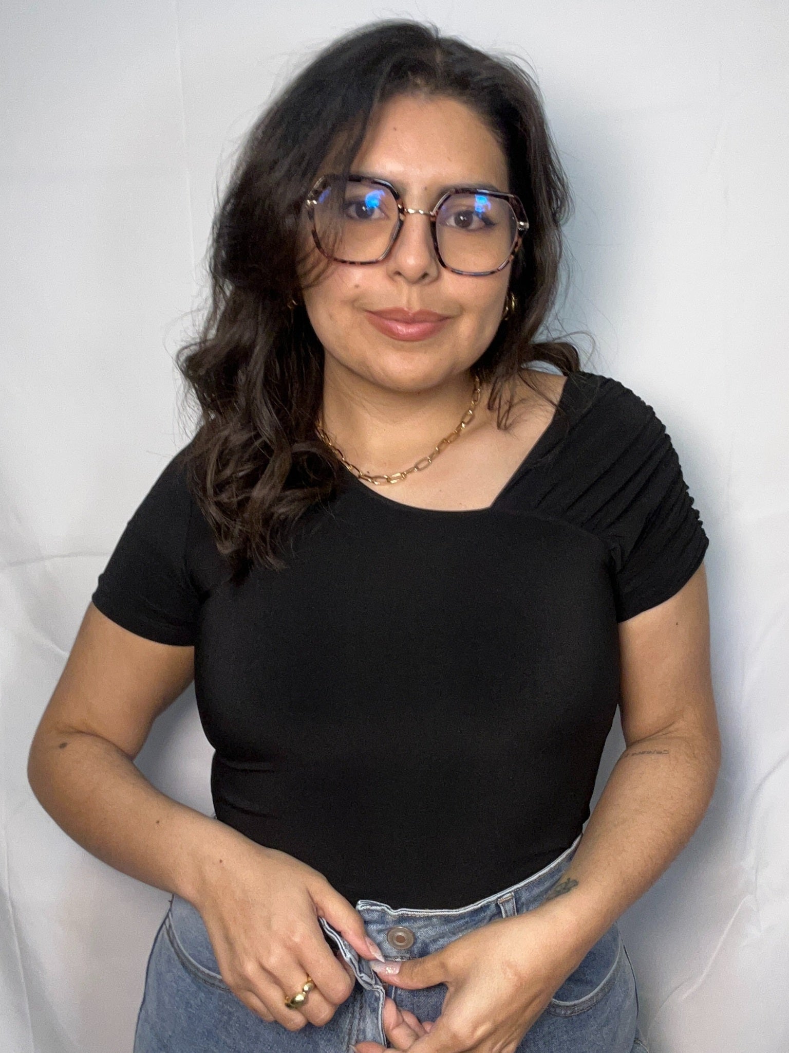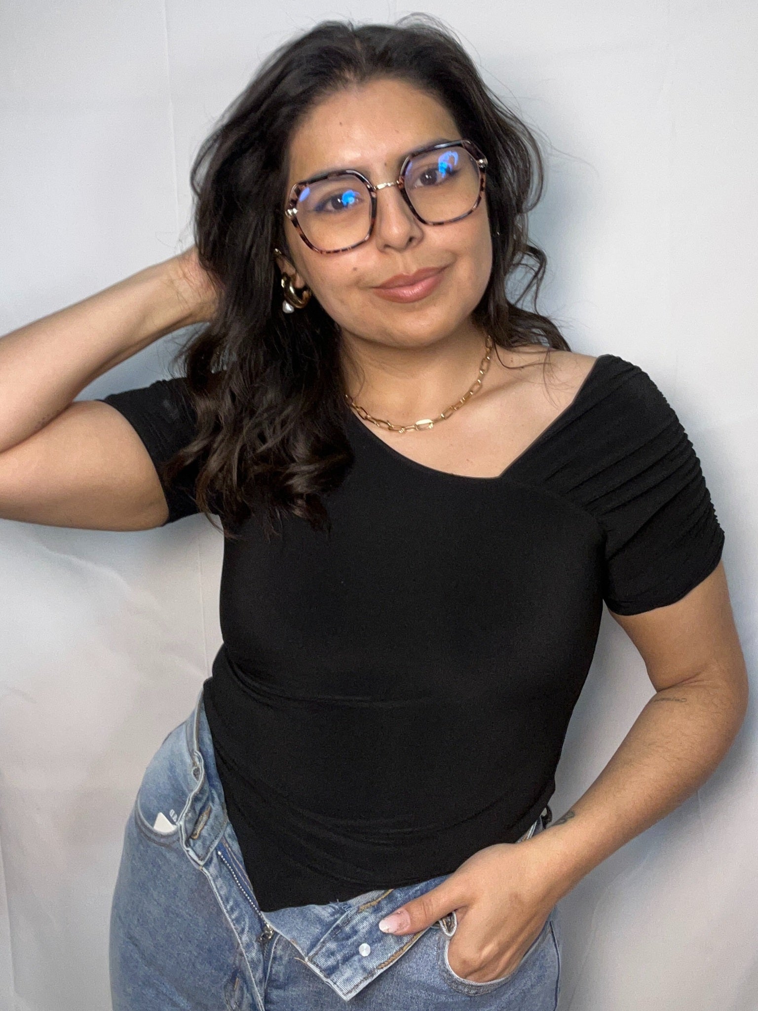 Confeccionado en tela suave y elástica, se ajusta cómodamente a la silueta, ofreciendo libertad de movimiento y un calce perfecto. Ideal para combinar con jeans, faldas o pantalones de tiro alto, este body negro es un básico imprescindible para crear outfits modernos, minimalistas y atemporales, perfectos para el día a día o una ocasión especial.
