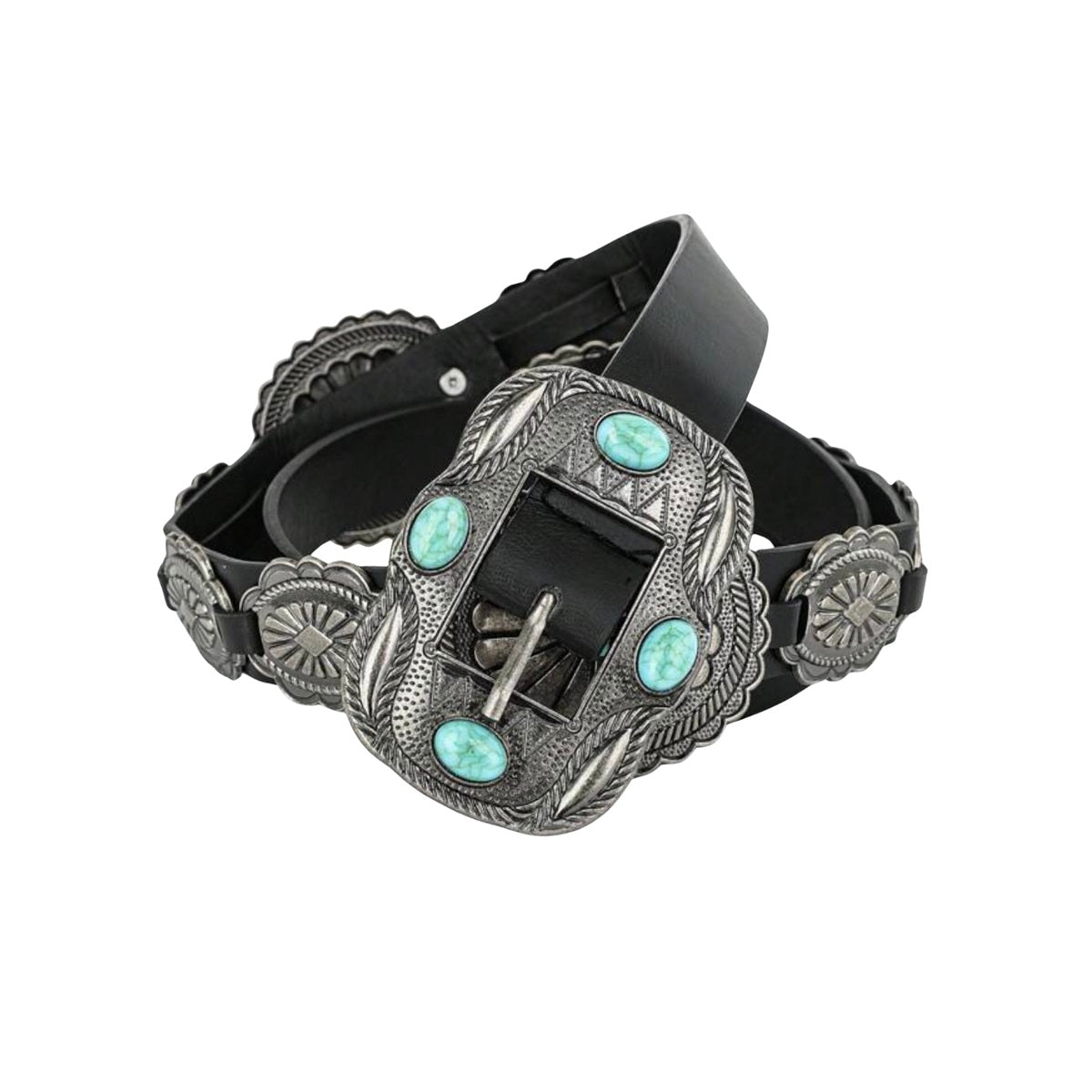 Dale un toque audaz y con carácter a tus looks con este cinturón vaquero de mujer color negro, diseñado con detalles metálicos grabados y piedras turquesa que realzan su estilo western. Su hebilla decorativa y apliques en tono plata envejecida lo convierten en un accesorio imprescindible para elevar cualquier outfit.