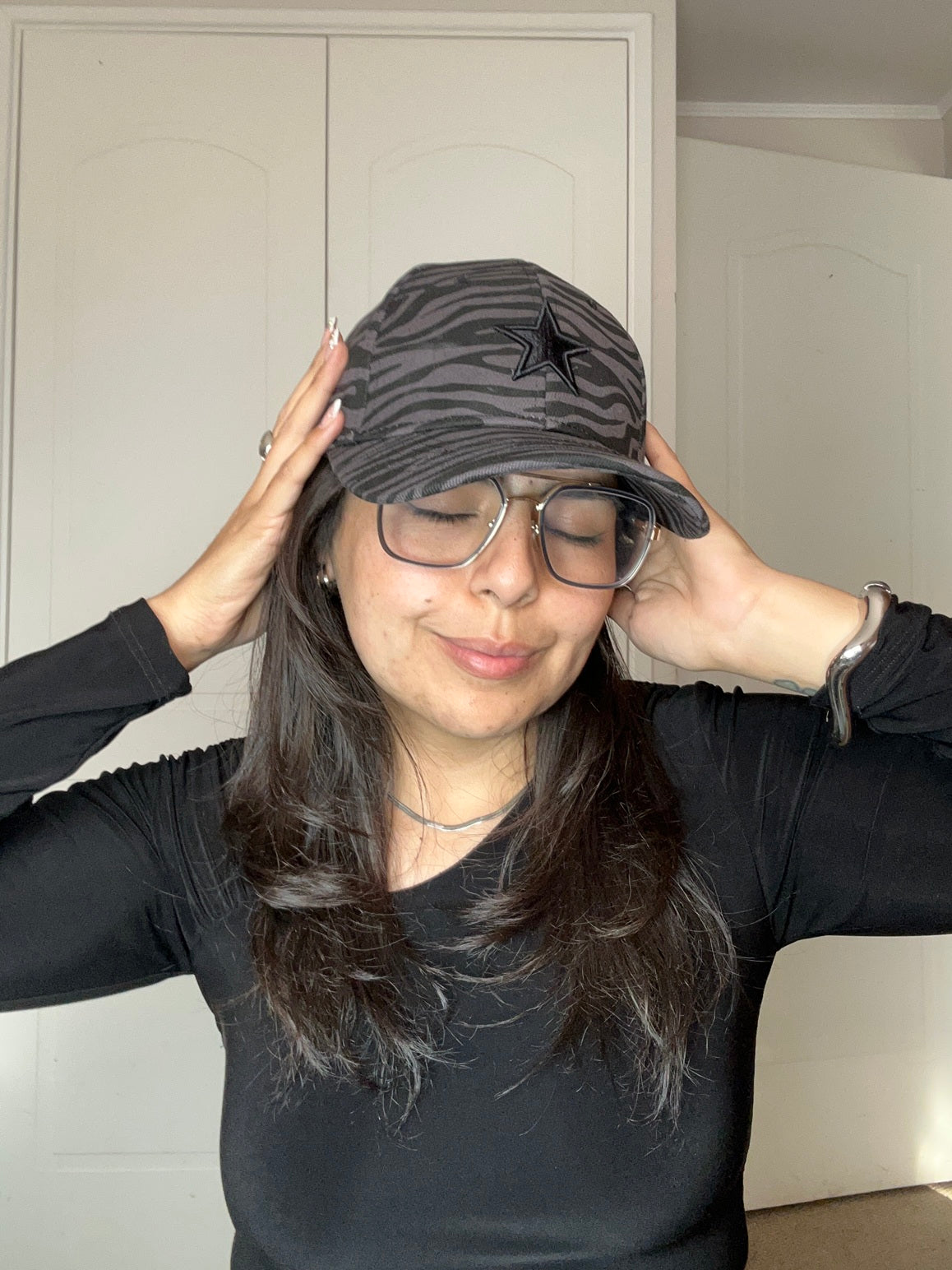 Dale un toque audaz a tus outfits con este jockey con estampado de cebra en tonos morados oscuros, una pieza única que combina moda urbana y personalidad. Su diseño destaca por el bordado de estrella frontal, que añade un detalle distintivo y moderno. Ideal para complementar looks casuales o streetwear, aportando actitud y estilo sin esfuerzo.