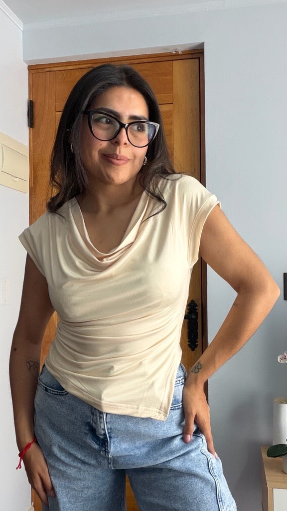 Polera color amarillo de cuello holgado con corte en punta, perfecta para quienes buscan un estilo delicado, limpio y favorecedor. La caída suave del cuello aporta un toque sofisticado, mientras que la terminación en punta crea un efecto visual que estiliza la cintura. Su tonalidad neutra la hace ideal para combinar con cualquier prenda y crear looks frescos, minimalistas y modernos. Ligera, cómoda y versátil: una básica imprescindible en tu clóset.