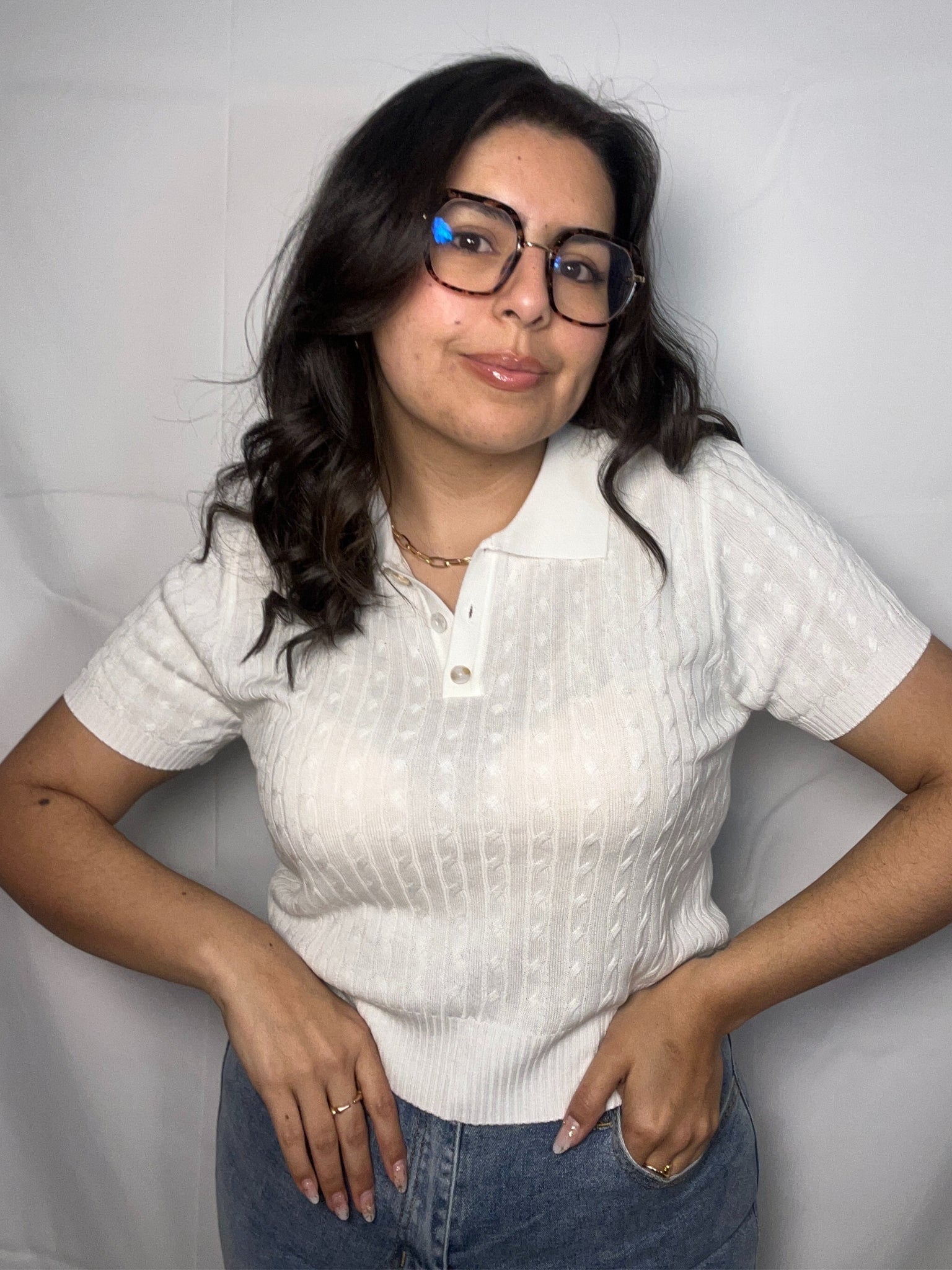 Eleva tu estilo con esta polera de hilo color blanco, una prenda versátil y atemporal que combina elegancia y comodidad. Su cuello tipo polo con botones aporta un toque clásico, mientras que el diseño tejido con relieve añade textura y un acabado sofisticado.