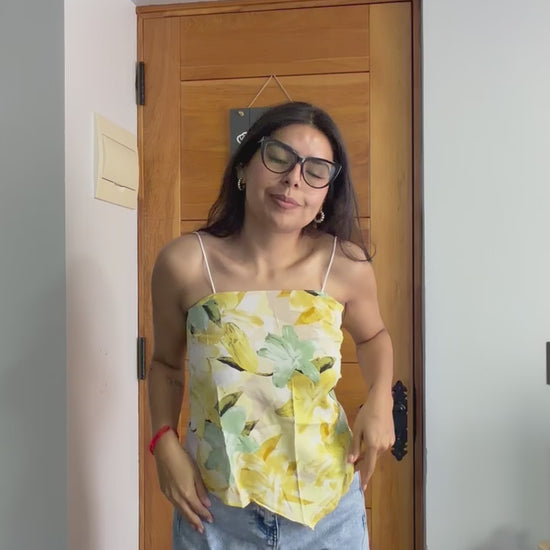 Ilumina tu closet con esta polera tipo pañuelo amarilla, ideal para looks alegres y modernos. Posee tirantes ajustables y un diseño versátil que puedes usar ceñido o suelto. Su tono amarillo vibrante aporta energía y estilo, perfecto para primavera y verano.