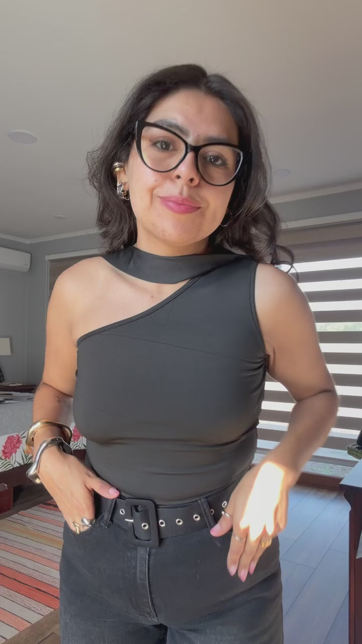 Polera color negro con diseño asimétrico y lazo ajustable, ideal para un look moderno y con carácter. Puedes ajustar el lazo alrededor del cuello o dejarlo como detalle decorativo sobre el hombro. Confeccionada en tela elasticada, se adapta perfectamente al cuerpo brindando comodidad y estilo. El color negro aporta elegancia y versatilidad, perfecta para combinar con jeans, pantalones o faldas tanto de día como de noche.