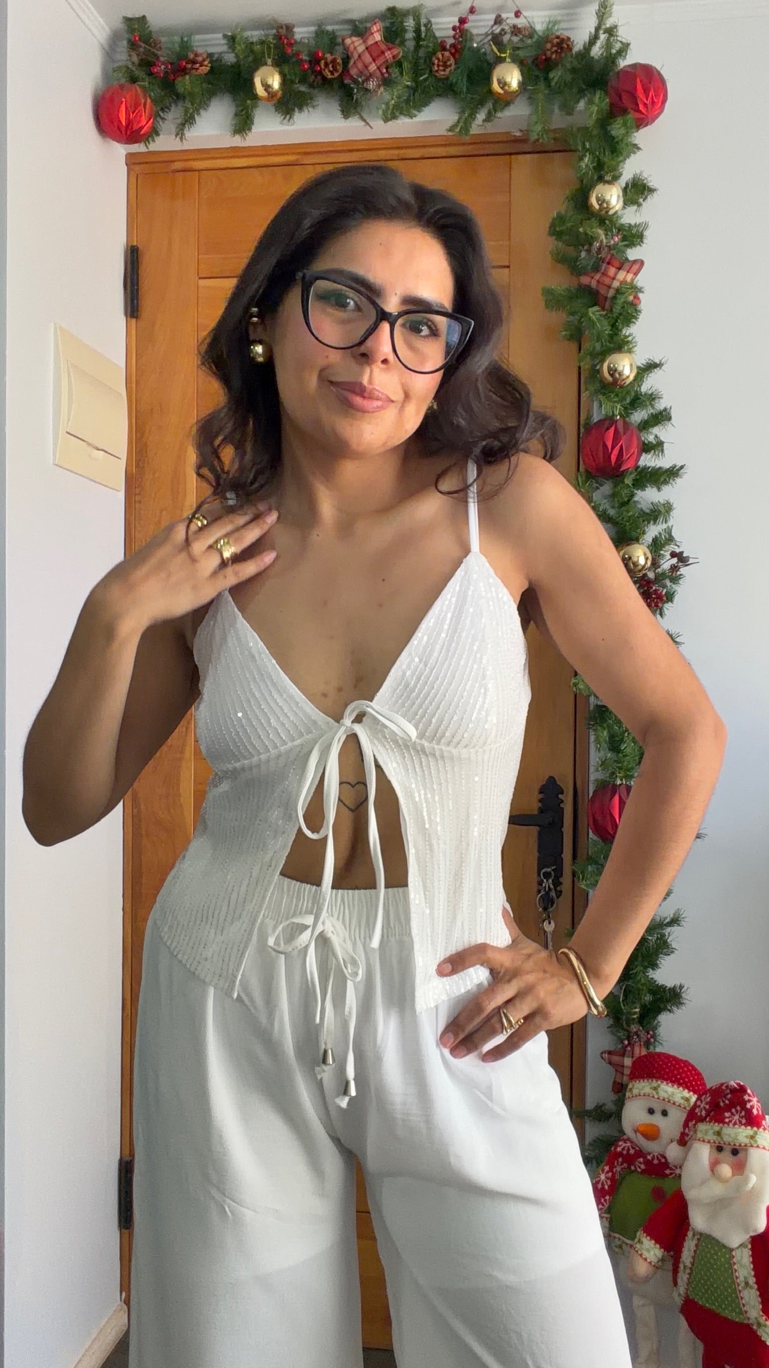 Destaca con elegancia con esta polera blanca de lentejuelas, una prenda diseñada para brillar con estilo en cualquier ocasión especial. Su diseño con amarras frontales ajustables realza la figura y permite un calce personalizado, mientras que el tono blanco aporta un look más limpio, moderno y sofisticado.